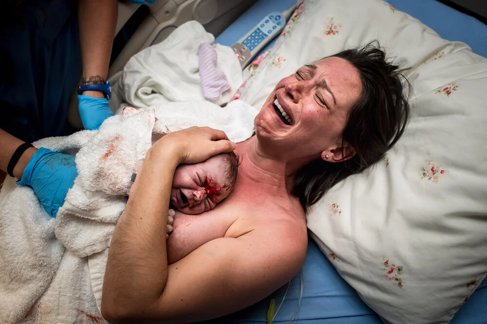 Sure enough, when the midwife checked Megan’s cervix, she was 9cm dilated, 90% effaced, and baby was at +1! The look on the midwife’s face was priceless, as I believe she saw the true power of HypnoBirthing! For a first time mom to move quietly from 1.5cm to 9cm in under 6 hours is pretty remarkable. Megs was starting to feel the natural expulsion reflex and did a wonderful job of breathing through it for a while. However, she went with her body’s strong desire to push when the sensation came. She pushed for over an hour, and baby was so close the entire time! Her stats dropped a bit from all of the hard work, so they offered her oxygen. She kept going, switching between breathing down and pushing. She saw her baby’s head in a mirror, felt the softness of its hair in between surges, and continued on. Each surge stretched her body a little bit more, allowing for the entrance of her sweet baby. Her best friend Summer came to photograph the birth but ended up helping to hold a leg toward the end so Jared could receive his baby. They didn’t know the gender so we were all full of anticipation. Finally, at 2:59pm, Baby Boy Heath exited his mother’s body (with his hand on his head!) and entered his father’s hands in a calm I can barely explain. He was perfect in every way! Beautifully pink, head full of dark hair, breathing immediately. He looked exactly like Jared and Megan both at the same time. He moved up to his mother’s chest, as everyone in the room had eyes filled with tears of joy.